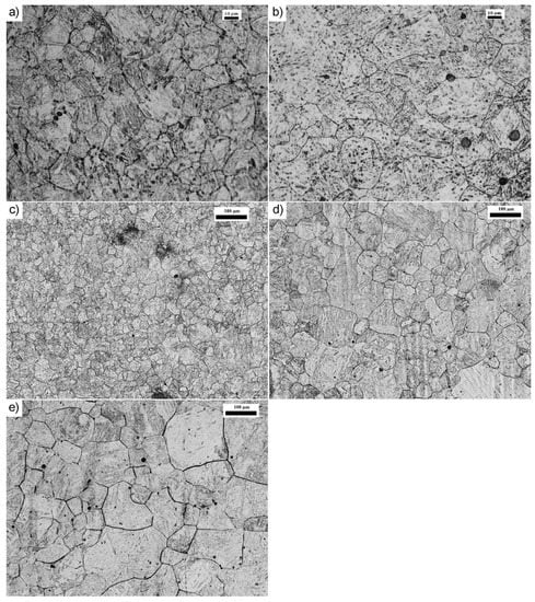 Micrographs of austenite grain boundaries in the as-received state and under different annealing conditions: (a) in the as-received state; (b) 900 °C, 20 min; (c) 1000 °C, 20 min; (d) 1100 °C, 20 min; (e) 1200 °C, 20 min. Etched state, light microscope.
