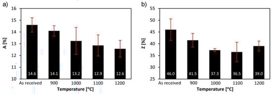Percentage elongation (a) and percentage reduction of area (b) of the tested steel in the as-received state and after different austenitization temperatures.