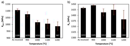 Tensile strength (a) and yield strength (b) of tested steel in the as-received state and after different austenitizing temperatures.