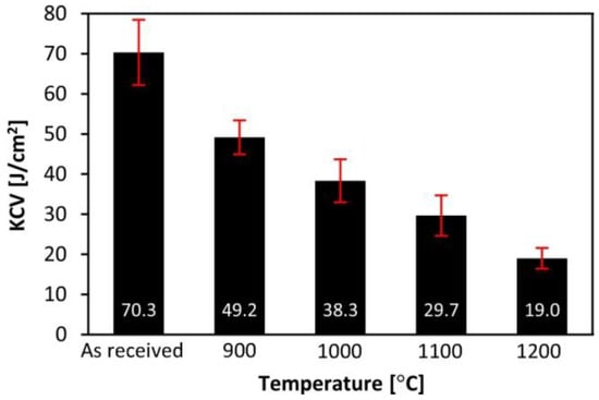 Assuming the criterion of a minimum impact strength equal to 35 J/cm2, this steel meets this criterion until the austenitization temperature reaches 1000 °C. After austenitizing at a temperature of 1100 °C, the impact strength of this steel was 30 J/cm2, which was not much lower than the criterion cited. The criterion of a minimum impact strength equal to 35 J/cm2 is adopted for construction materials in many applications [].