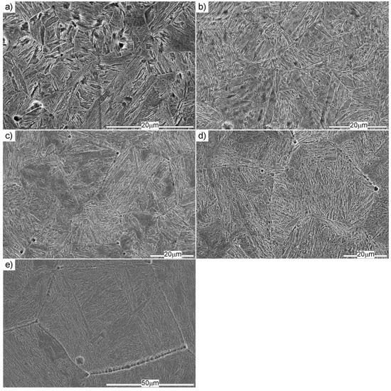 Micrographs showing martensitic packets in the Hardox 450 steel in the as-received state and under different annealing conditions: (a) in the as-received state; (b) 900 °C, 20 min; (c) 1000 °C, 20 min; (d) 1100 °C, 20 min; (e) 1200 °C, 20 min. Etched state, SEM.