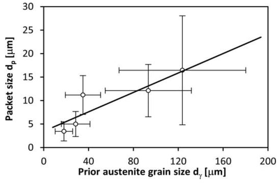 In turn, the analysis of the impact of the martensite packet sizes on the yield strength has shown that, in the case of the lath martensite structure, the dependence described by the Hall-Petch relationship closely relates to the packet sizes as well as the effective martensite grain size in the low- and medium-carbon steel. It can be concluded that a change in the yield strength in the Hardox 450 steel corresponds with the inversion of the square root of the former austenite grain and the martensite packet size (Figure 17). However, it has to be underlined that the noted drop in the yield strength, as a result of the increase in grain size of the prior austenite from 18 µm to 124 µm (almost 700%), amounted only to 119 MPa (about 11%). In relation to the martensite, lowering the yield strength by the given value corresponded to an increase in the packet size of about 480% (3–16 µm). However, the impact of the increase in grain size of the former austenite and the packet size on the static tensile strength was not observed to be large.