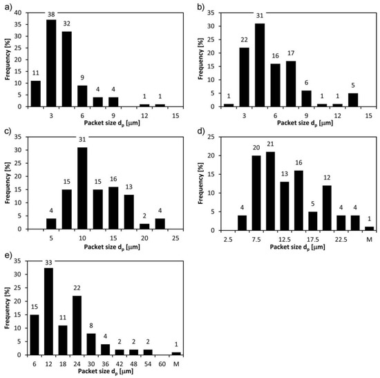Distribution of martensite packet size in Hardox 450 steel with the prior austenite grain sizes: (a) 18 µm; (b) 28.5 µm; (c) 35 µm; (d) 93.3 µm, M—packet size more than 25 µm; (e) 123.7 µm, M—packet size more than 60 µm.