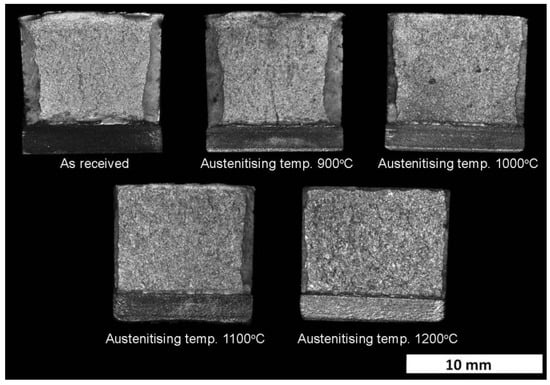 Macroscopic analysis of the tested samples showed a significant divergence in the assessment of the embrittlement threshold based on the value of impact strength and direct analysis of the fracture. In all samples, there is a large central zone with typical facets for brittle fracture. In the case of the tested steel in the as-received state and after austenitizing at 900 °C, the plastic zones under the mechanical notch and in lateral edges shared respectively 28% and 30% of the whole fracture. In the case of samples austenitized at 1000 °C, the central brittle zone occupied more than 77%. Samples austenitized at higher temperatures were constantly characterized by nearly 100% fraction of brittle fracture—84% (for the sample austenitized at 1100 °C) and 89% (for the sample austenitized at 1200 °C). The fraction area of brittle fracture significantly increases by about 27% with increase in the austenitizing temperature.