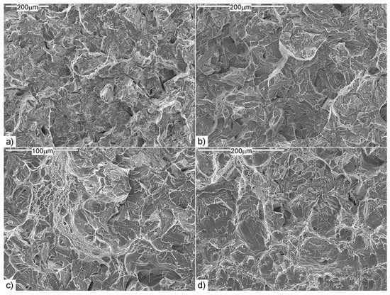Figure 11 summarizes the macroscopic views of fractures of the tested steel at temperature—40 °C in the as-received state and after different austenitizing temperatures. Figure 12, Figure 13, Figure 14, Figure 15 and Figure 16 show representative SEM images of the fracture surfaces of the investigated steels.