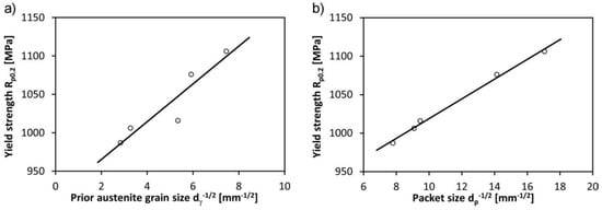 Dependence of the yield strength on the prior austenite grain size (a) and the martensite packet size (b) for the Hardox 450 steel.