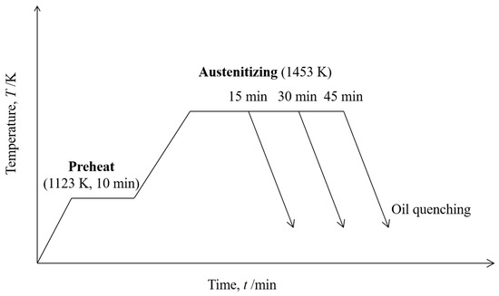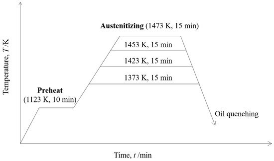 The specimens machined into 20 mm × 20 mm × 20 mm were heated to 1373, 1423, 1453, and 1473 K (1100, 1150, 1180, and 1200 °C) at a rate of 10 K/s, and then held for 15 min followed by oil quenching in a box-type furnace. The specimens which heated to 1453 K (1180 °C) were held for 15, 30, and 45 min. Figure 1 and Figure 2 show the detailed quenching process. In order to avoid the deformation and cracking due to excessive internal stress of the steel, the specimens were preheated at 1123 K for 10 min. The as-cast steel, as well as the quenched specimens, were machined into 10 mm × 10 mm × 10 mm and polished for microstructural observation using scanning electron microscope (SEM, Carl-Zeiss, Oberkochen, Germany). The average grain size of the specimens and volume fraction of carbides were counted by Image-Pro Plus software. The final value was the average by measuring 10 photos of each condition. Specimens for grain size measurement were polished and etched using a Nital etchant (Ethanol + 4 vol. % Nitric acid) to reveal the grain boundary, and then measured according to GB/T 6394-2002. Rockwell hardness tests were conducted on these specimens (10 mm × 10 mm × 10 mm) using a Hardness Tester (TIME, Beijing, China). Impact toughness of the specimens with different austenitizing conditions were measured by Charpy Tester (SANS, Shenzhen, China), the specimens were machined into 10 mm × 10 mm × 55 mm without notch.