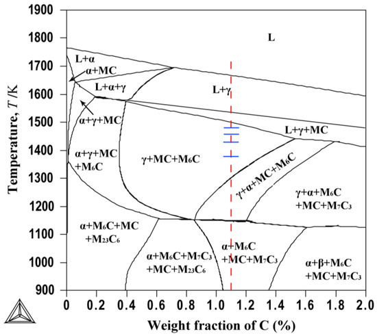 Phase equilibrium diagram of AISI M42 HSS calculated using Thermo-Calc software. A dotted vertical line means the C concentration (1.11 wt. %) of the present steel. The blue lines show the region of four different temperatures.