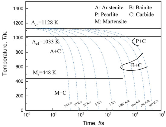 The determined CCT diagram of AISI M42 HSS austenitized at 1473 K (1200 °C) was shown in Figure 4. The dotted lines means different cooling rates range from 100 K/h to 30 K/s. The martensite point (Ms), critical temperatures of Ac1 and Ac3 (the start and end of austenitic transformation on heating) were determined corresponding to a heating (10 K/s) up to 1473 K (1200 °C) and subsequent cooling down (5 K/s) to room temperature. As shown in Figure 4, the pearlitic transformation is only possible when the cooling rate is as slow as 100 K/h. Bainitic transformation occurs at the range from 100 to 1000 K/h. For the cooling rate of 1 to 30 K/s, martensite would precipitate directly and cross the area of pearlite and bainite.