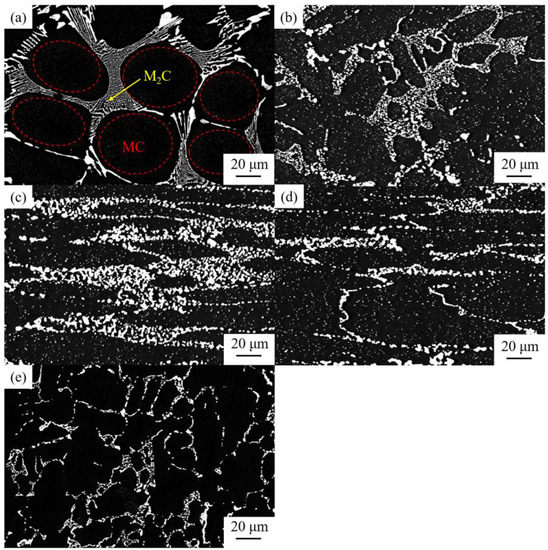 SEM microstructures of the as-cast AISI M42 HSS specimen (a); the oil cooling specimens at 1373 K (b); 1423 K (c); 1453 K (d); and 1473 K (e).
