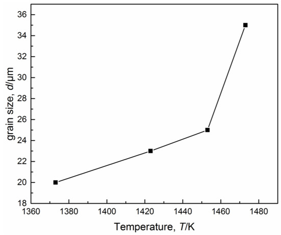 SEM micrograph of as-cast HSS specimen was shown in Figure 5a. As indicated by arrows, network carbides M2C, and graininess-shaped carbides MC (red circles) were found in the micrograph. However, M2C did not appear in the phase stability diagram because M2C particles are in the metastable phase. MC carbides were dispersed in the matrix and the average size of them was much smaller than M2C carbides. The grains in the as-cast HSS were completely surrounded by the layers of M2C, namely, grain boundaries (GBs) were completely wetted by the second solid phase M2C carbides. Microstructure of AISI M42 HSS specimens oil cooled at different temperatures were shown in Figure 5b–e. The population of the carbides was being steadily reduced with the increase of temperature during austenitization. When the austenitizing temperature was 1373 K (1100 °C), fibrous M2C particles decomposed into M6C and MC particles [13,14]. However, the network morphology of carbides still exists as shown in Figure 5b. With the increasing of austenitizing temperature, the continuous network distribution of carbides turn to be broken and scattered as shown in Figure 5c,d. The portion of completely wetted GBs decreased as well. When GBs wetted by a liquid phase (melt), the amount of completely wetted GBs always increases with the increase of temperature due to higher entropy of a melt [15,16]. However, when GBs are wetted by a second solid phase, the completely wetted GBs will decrease with the increase of temperature [17,18]. Moreover, Ms point will decrease and the stability of austenite will increase because the high-temperature austenite dissolves more carbon and alloying elements with the increase of austenitizing temperature [19,20]. When the austenitizing temperature reaches 1473 K (1200 °C), more carbides dissolve into the metallic matrix so that the quantity of carbides reduced rapidly as shown in Figure 5e. No sufficient number of carbides were available to pin down the grain boundaries to prevent grain coarsening, so it is more probable for cracks to be formed [4,9]. Besides, austenitizing temperature approaching the melting point of the experimental AISI M42 HSS (1500 K) leads to partial melting and agminate carbide precipitation of the specimen. Figure 6 shows the relationship between the average grain size and austenitizing temperature of the specimens. The average grain size presents a smooth increase with the increase of temperature. However, it shows an impressive promotion (35 μm) during a period from 1453 to 1473 K. Consequently, an excessive increase in temperature results in increased carbide dissolution and unwanted grain growth.