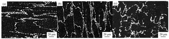 The mechanical properties of AISI M42 HSS are determined by the martensitic matrix and distribution of carbides. The cast structure of high-speed steel can be improved by subsequent heat treatment processes such as annealing, quenching, and tempering. Under annealing conditions, high-speed steels have a ferrite matrix with plenty of undissolved carbides. Following quenching, they contain martensite, retained austenite, and undissolved carbides. The final microstructure after tempering, which may occur several times, mainly consists of tempered martensite and well-distributed hard carbides [1,4,5,6]. It is known that microstructural factors like distribution of carbides, as well as characteristics of the martensitic matrix, play important roles in optimizing the properties of high-speed steel such as hardness, wear resistance, fracture toughness, and thermal-fatigue behavior. It is also well known that the martensite morphology of HSS depends on austenitizing temperature and its holding time, prior deformation of the austenite matrix, chemical composition of alloys, and the cooling rate [7,8]. A lot of studies have been performed on the effects of austenitizing conditions on the microstructure of high-speed steel. Sarafianos [9] reported that the mechanical properties of high-speed steel can be improved by austenitizing heat treatment at 1463 K for 30 s. The microstructure is altered to a mixture of martensite and retained austenite, and the types of carbides after austenitizing are mainly Mo and W enriched carbides. Hashimoto et al. [10] noticed that the austenitizing time did not significantly change the morphology, size, and distribution of eutectic carbides. Fu et al. [11] investigated the effects of quenching and tempering treatment on the microstructure, mechanical properties, and abrasion resistance of high-speed steel. Their results showed that the hardness of high-speed steel increased with the increase of austenitizing temperature, but decreased while the austenitizing temperature exceeds 1323 K. When the austenitizing temperature reached 1273 K, the metallic matrix all transformed into martensite. Afterwards, the eutectic carbides dissolve into the metallic matrix and their continuous network distribution changed into the broken network. However, Kang et al. [12] reported that the HSS showed the best wear resistance when the austenitizing temperature was 1473 K, because M6C phase was dissolved at such a high temperature, only MC carbide could be stable for its property of hindering crack propagation. Accordingly, opinions are divergent on the effective austenitizing temperature and its holding time, which are beneficial to the mechanical property of high-speed steel.