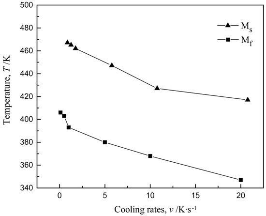 As the cooling rate increases, the value of the Ms and Mf points decrease consequently (Figure 9). When the cooling rate is 5 K/s, the value of Ms and Mf are 448 K (175 °C) and 380 K (107 °C), respectively. When the cooling rate reaches 20 K/s, the value of Ms and Mf decrease to 419 K (146 °C) and 347 K (74 °C), respectively.