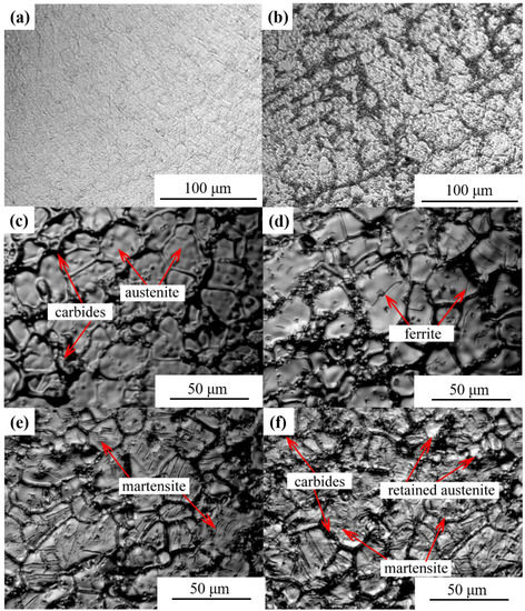 In-situ observation of phase transformation during austenitizing process of AISI M42 HSS with the cooling rate of 5 K/s: (a) 1423 K (×500); (b) 1473 K (×500); (c) 1473 K (×1000); (d) 1281 K (×1000); (e) 446 K (×1000); (f) room temperature (×1000).