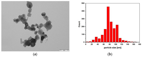 (a) Typical AlN nanoparticles (scale bar: 200 nm) and (b) their particle size distribution.
