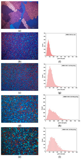 Microstructures of (a) AM60 and (b) AM60 + AlN. Microstructures of the first, second, and third recycled castings are shown in (c–e), respectively. Grain size distributions of (b–e) are presented in (f–i), respectively.
