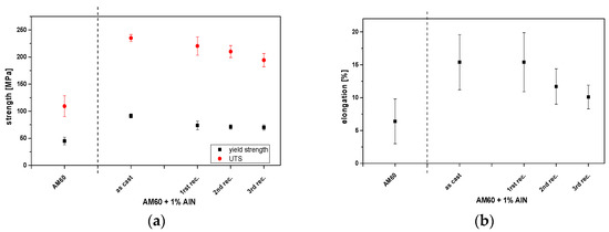 Taking the grain sizes from Table 1 and to be 530.2 MPa µm1/2, the strengthening contribution from grain size reduction according to Equation (A2) is 42.7 MPa for the as-cast nanocomposite, and 34.9 MPa, 25.0 MPa, and 23.0 MPa for the first, second, and third remelted nanocomposites. The strength increase due to grain refinement after Equation (A2) for the recycled materials is close to the measured strength increase. There is a gap of 3.6 MPa for the as-cast AM60 + AlN that may be generated by one of the other strengthening mechanisms mentioned above.