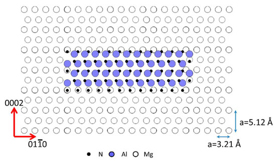 AlN has a hexagonal crystal structure with the lattice parameters a = 0.311 nm and c = 0.498 nm, and Mg has the same lattice structure with lattice parameters of a = 0.321 nm and c = 0.512 nm [30]. The mismatch between Mg and AlN was approximately 3.1% between the {100} planes and 2.7% along the (0001) planes. The close matching between Mg and AlN is illustrated in Figure 5. Similar mismatches were observed on other major planes of AlN and Mg. The similarities in crystal structure and lattice parameter means that growth of Mg on an AlN particle is relatively easy and does not require accommodation of large strain, and the differences in lattice parameter can be overcome locally in the first layers of Mg that grow on the AlN particles.
