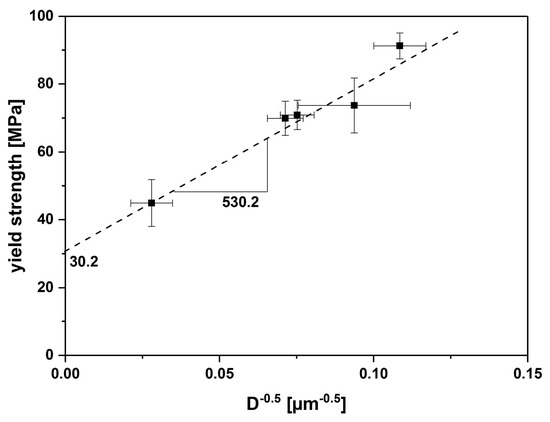 Hall-Petch relation: (Equation (A1)), where is the yield stress, is the friction stress that allows dislocations to move on slip planes in a single crystal in the absence of any strengthening mechanisms, is the stress concentration factor, and is the average grain size [44,45].