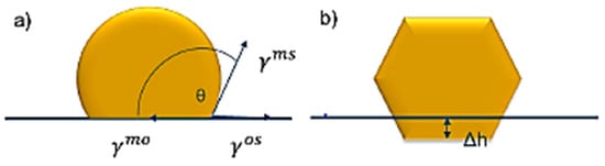 Schematic representation of an equilibrium cluster (a) Isotropic surface, γms and γos are metal and oxide surface energy, and γmo is the interfacial energy between the metal and oxide; (b) anisotropic surface and faceted shape (Wulff construction); the cluster is truncated into oxide (Δh), which is dependent on the cluster surface energy and adhesion energy; Reproduced with permission from [16], World Scientific, 2001.