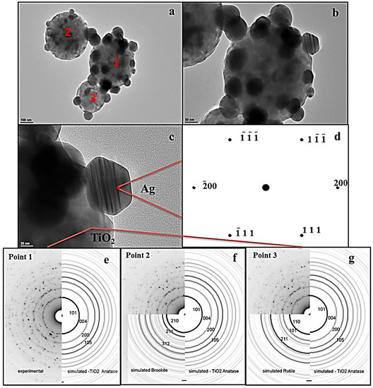 TEM micrographs of Ag/TiO2 powder: (a) TiO2 nanoparticles with the distributed Ag nanoparticles; (b) TiO2 nanoparticles with partly-defined primary nanoparticles and clearly visible Ag nanoparticles; (c) Defect in Ag nanoparticle structure (twins); (d) simulation of the transmission electron diffraction for Ag in the [011] TiO2 plane; electron diffraction patterns of Ag/TiO2 powder from the upper image (a) where only a TiO2 component was analyzed and simulated results for (e) anatase; (f) anatase and rutile; and (g) anatase and brookite.