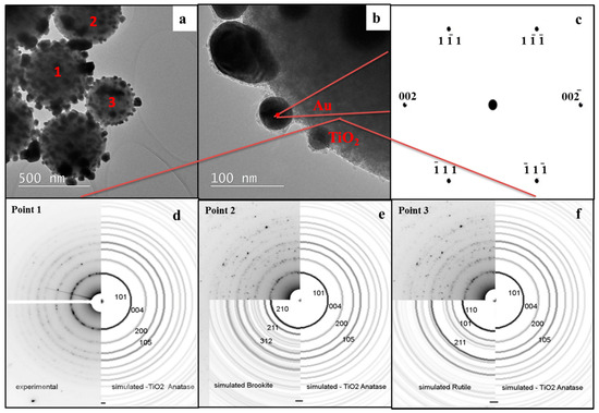 TEM micrographs of Au/TiO2 powder: (a) polygonal (almost spherical) TiO2 nanoparticle with distributed Au nanoparticles; (b) details of Au nanoparticles; (c) simulation of the transmission electron diffraction for Au in the [001] TiO2 plane. Electron diffraction patterns of Au/TiO2 powder where only a TiO2 component was analyzed and simulated results for (d) anatase; (e) anatase and rutile; and (f) anatase and brookite.