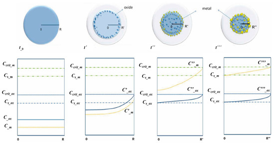 At a further reaction time t’’, the corresponding droplet diameter decreased to R’’ due to advanced evaporation. Moreover, at this stage of reaction, the on-going oxide precipitation moved through the center while the metallic precursor had reached the critical supersaturating concentration (Ccrit_m) so that the heterogeneous nucleation of the metal component on the already-existing oxide surface could take place. Since it is thermodynamically more favorable, the precipitation starts predominantly on the surfaces with lower effective surface energy, such as the grain boundary, defects, etc. At the last t’’’ point, almost all solvent evaporated and the droplet/particle had reached the R’’’ diameter. In the ideal case, all metallic precursors had succeeded in diffusing with the solvent to the droplet/particle surface and precipitated there. In the case that the precipitation front was moving faster than the diffusion front, some of the metal precipitation may also occur in the particle volume. This may occur at the relatively low value of Ccrit_m or, in the case of very small droplets, due to solvent evaporation in the droplet/particle volume.