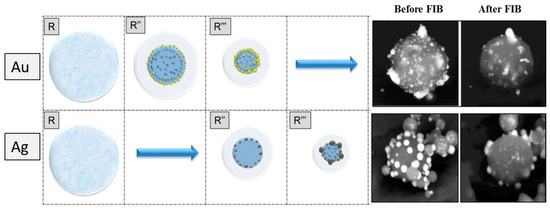 Schematic representation of the proposed new model for metal/oxide nanoparticle formation, applied on Ag/TiO2 and Au/TiO2 nanoparticles with the examples of the microstructural analyses confirmed before and after FIB milling [20].