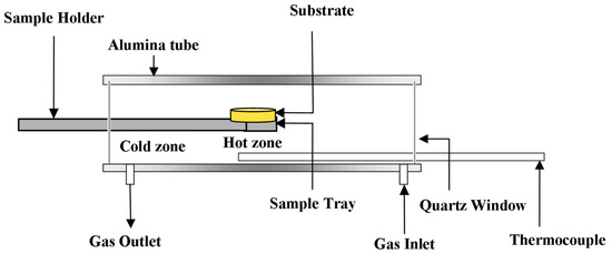 High purity (≥99.8%) materials were used in this study to prepare two sets of blends. While fused alumina was supplied by Alcoa, other constituents—namely, silica, iron oxide and synthetic graphite powders—were obtained from Sigma Aldrich (Castle Hill, Australia) the average particle sizes of all constituents were ≤50 µm. Two sets of samples were prepared. Powders of SiO2 and Fe2O3 were mixed together in the ratio 70:30 (wt. %) in “Set 1”. In “Set II”, Al2O3, SiO2 and Fe2O3 were mixed together in the ratio 35:35:30 (wt. %). In addition, 35 wt. % graphite and 5 wt. % bentonite (binder) were added to these powder mixtures. These blends were then ball milled for 48 h to ensure a complete and thorough mixing. Cylindrical substrates (25 mm dia., 3 mm thick) were prepared by compacting the mixture in a steel die using a hydraulic press and pressing to a pressure up to 10 MPa. The compacted substrates were baked at 150 °C for 48 h for enhancing their structural integrity. High temperature investigations on Fe2O3-SiO2-C and Fe2O3-Al2O3-SiO2-C substrates were carried out at 1550 °C for times of up to 60 min in a laboratory scale, horizontal tube resistance furnace. The furnace tube was purged with 99.99% pure argon throughout the duration of the experiment, with a flow rate of 1.0 L/min. A schematic representation of the experimental set-up is presented in Figure 1.