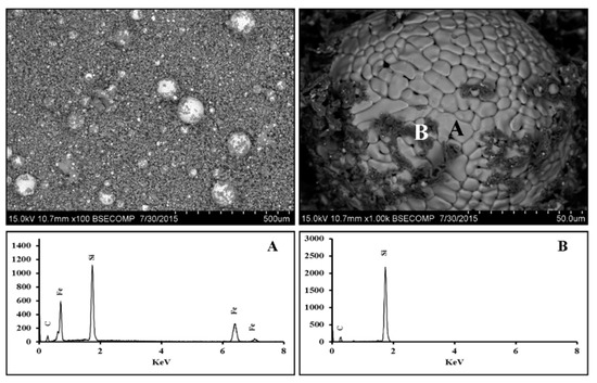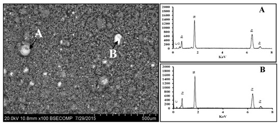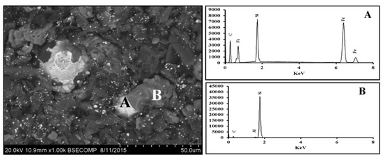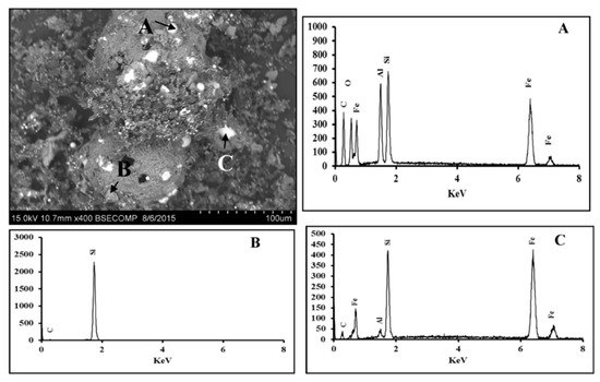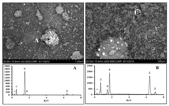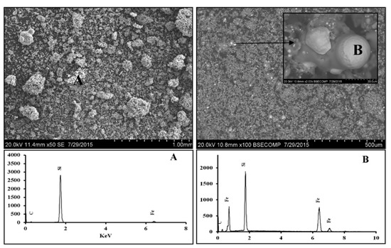 The presence of two distinct phases, “A” and “B”, in the SEM/EDS micrographs. Phase “A”, in the form of fine powder, mainly contains Si and C; and phase “B”, in the form of shiny metal droplets, has Si and Fe as its main constituents.