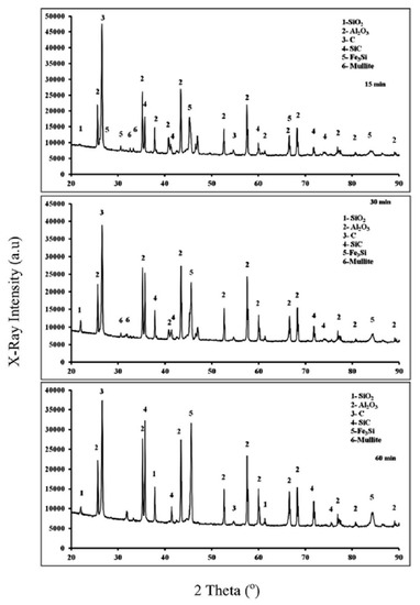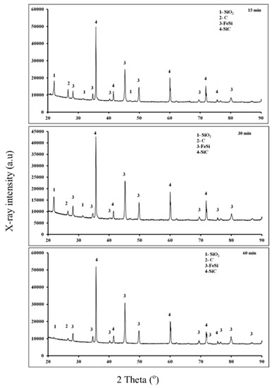 The detailed X-ray diffraction (XRD) results from reaction products after 15, 30 and 60 min of heat treatment at 1550 °C are shown in Figure 5. After 15 min of heat treatment, iron oxide had reduced completely to iron as no XRD peak could be identified with this phase. This result is consistent with the published literature; the reduction of iron oxide is quite rapid at this temperature, and is expected to reach completion within few minutes [22]. While there was still some unreduced silica and unconsumed carbon, there was clear evidence of the formation of SiC and FeSi phases. Not much change was observed after 30 min. Silica reduction was, however, complete after 60 min, as silica peaks had been much reduced in intensity; the peaks for FeSi and SiC remained quite strong. These XRD results are in good agreement with the HRSEM/EDS results. Both these techniques indicated the reduction of silica and iron oxide, and the formation of SiC and FeSi alloys after various heat treatments at 1550 °C.