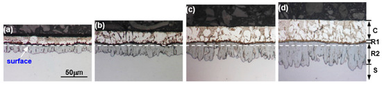 The optical microscope image in Figure 1 shows the structure of the specimen that was coated at 690 °C for 30–180 s. For the reasons mentioned above, the temperature for hot dip-coating was set at 690 °C, which is 50 °C higher than the melting point of the Al–7Ni alloy (640 °C) [24]. After a dipping duration of less than 30 s, the coating was either not formed or formed only locally. The white line in the figure indicates the original surface of the base metal. Even when the dipping durations were changed, the microstructures of the coated specimens remained the same. As shown in Figure 1d, three layers (C, R1, and R2) were formed. However, the thickness of each layer changed with the dipping duration.