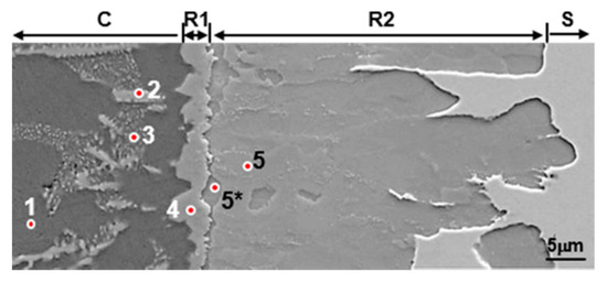 The R1 layer (black layer in Figure 1), which was formed between the C layer and the microstructure of the steel (S), is believed to be Al–Fe–Ni, an IMC formed by a reaction between the liquid phase and the steel. The R2 layer is considered to be Al–Fe, another IMC. It can be concluded that R1 is a reaction layer formed by the diffusion of Al, which is a coating component, toward the base material.