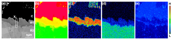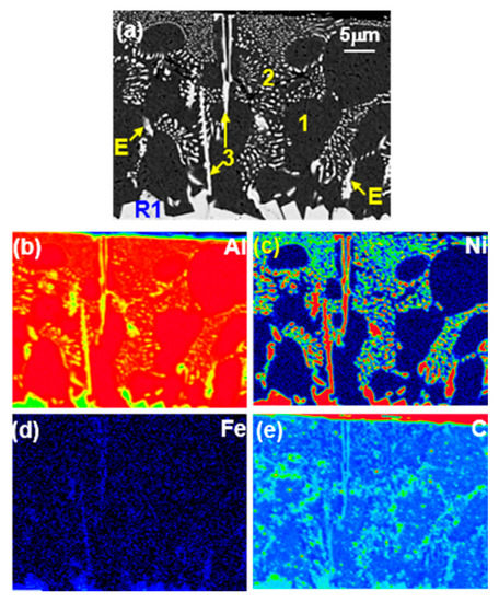 Figure 5a shows a typical back-scattered electron (BSE) image near the reaction layer R1 in Figure 2, while Figure 5b–e shows the concentration distributions of Al, Ni, Fe, and C obtained from the results of EPMA area analysis. When comparing the concentrations of constituent elements in the R1 and R2 regions, it can be seen that the concentration of Al in R1 was higher than that in R2, but the concentration of Fe was low. In addition, R1 contained Ni, but Ni was hardly present in R2. It can thus be concluded that R1 was an Al–Ni–Fe compound and R2 was an Al–Fe compound. In order to identify these phases, a TEM specimen was obtained with a FIB along the depth in the area denoted by X1 in Figure 5a. The microstructures were then analyzed using STEM and EDS.