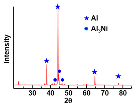 Figure 3 shows the SEM image of the microstructure and EPMA surface analysis results of the coating, which was a solidified microstructure on the top layer (denoted as C in Figure 1). Figure 4 shows the XRD analysis results of the surface of the coated layer, indicating that the coated layer consisted of two phases of Al and Al3Ni. Based on the binary phase diagram of Al–Ni alloys [24], the phases that can be formed in a Al–7Ni alloy are as follows. The eutectic reaction [L = αAl (0.25 wt % Ni solid solution) + Al3Ni] occurs at a composition of 5.7 wt % Ni at 640 °C. The primary Al phase has a solubility of about 0.25 wt % Ni at temperatures between room temperature and 640 °C. At a composition of 5.7 wt % Ni or higher, the primary phase is the intermetallic compound Al3Ni. If the 7 wt % Ni alloy with hypereutectic composition is cooled (air cooling) from a coating temperature of 690 °C, primary Al3Ni is formed at 660 °C, and then a eutectic reaction occurs at 640 °C. Finally, a solidified microstructure is composed of primary Al3Nl and the eutectic phase (αAl + Al3Ni).