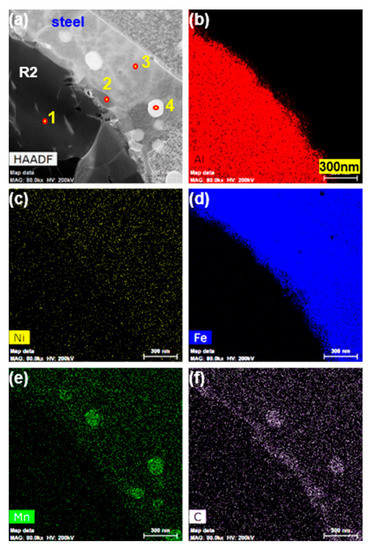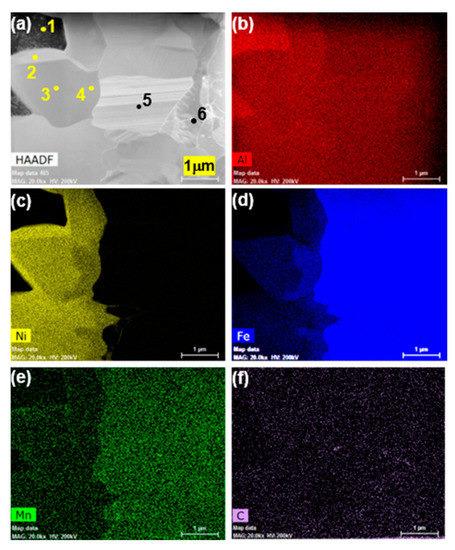 Scanning transmission electron microscopy (STEM) results showing the of focused ion beam (FIB) specimen extracted from the area denoted by X1 in Figure 5: (a) high-angle annular dark-field (HAADF) Image; (b–f) results of EDS: (b) Al; (c) Ni; (d) Fe; (e) Mn; (f) C.