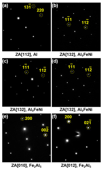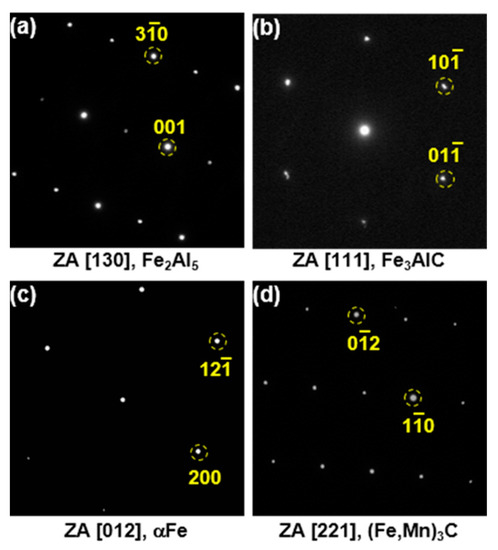 Figure 6a shows the TEM structure (high-angle annular dark-field (HAADF) image), and Figure 6b–f shows the concentration distribution of Al and Ni in the coating alloy and the distribution of Fe, Mn, and C in the steel, obtained by EDS analysis. Figure 7 shows the diffraction pattern and the analytical result of each phase indicated by 1–6 in Figure 6a, where ZA is the zone axis. Table 2 lists the composition of each phase determined by EDS. From the analysis results of the EDS composition and the diffraction pattern, phase 1 was found to consist of only Al. Phases 2, 3, and 4, which contained Al and Ni and a small amount of Fe, were all identified as the Al9FeNi (T) phase with a monoclinic crystal structure (space group: P21/c). As shown in Figure 6a–d, Al9FeNi was characterized by the difference between the concentrations of Ni and Fe present in the crystal grains. On the other hand, from the diffraction pattern and the EDS analysis results shown in (e) and (f), phases 5 and 6, which contained high concentrations of Fe, Al, and Mn, were found to be the Fe2Al5 (η) phase, an IMC with orthorhombic crystal structure (space group: Cmcm).