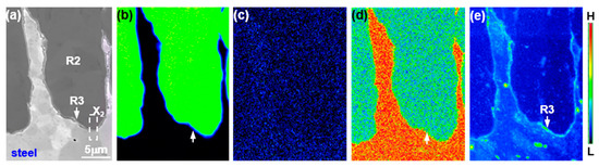 When the Al9FeNi (T) phase was formed on the steel substrate, the steel substrate did not react with the liquid phase; instead, it only reacted with the already formed Al9FeNi (T) phase. In other words, Al and Ni diffused from the T phase to the inside of the steel, and Fe, Mn, and C, which are the elements of steel, diffused toward the Al9FeNi (T) phase to form a reaction phase. This phenomenon is similar to the Wołczyński’s model, in which a reaction phase is generated by solid- diffusion during hot-dipping [25]. Therefore, the phase formed by the reaction through solid diffusion of Al was the Fe2Al5 (η) phase, which is marked as R2 in Figure 5, Figure 6, Figure 7, Figure 8, Figure 9 and Figure 10, and it was not the FeAl3 (θ) phase formed by the reaction with the liquid phase. According to the study by Naoi and Kajihara on the Al-Fe solid-phase diffusion reaction, in which the Fe2Al5 (η) phase was formed at the Fe–Al interface, FeAl, FeAl2, and FeAl3 were thermodynamically stable, but they could grow to a distinctly visible thickness [12]. This result supports our finding. Meanwhile, it can be seen that the Ni concentration in the Fe2Al5 (η) phase (see Figure 8) is lower than that in the steel substrate, which means that Ni had low solubility in the η phase.