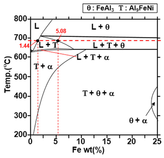 The (Al–7Ni)–Fe phase diagram (Figure 11) was drawn using Thermo-Calc™ to determine whether the T phase can be formed by the reaction of these elements at 690 °C. As can be seen from the phase diagram, when 1.44 wt % or more of Fe dissolves into the liquid phase of Al–7Ni at 690 °C (dipping temperature), a solid T phase is formed. In addition, if 5.08 wt % or more of Fe dissolves into the liquid phase, the FeAl3 (θ) phase is formed. However, since the Al9FeNi (T) phase is preferentially formed at the interface attached to the liquid phase, it can be formed with a smaller amount of Fe than is required for the FeAl3 (θ) phase.