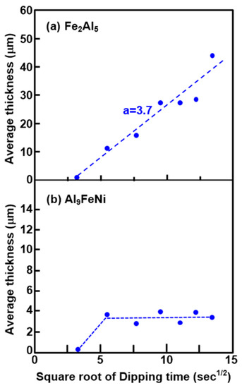 Figure 12a,b shows the changes in thickness of the Fe2Al5 (η) phase and Al9FeNi (T) phase as functions of the square root of the dipping time (s1/2). The thickness of the Fe2Al5 (η) phase increased linearly with the increases in the square root of the dipping time. This means that the growth kinetics of the Fe2Al5 (η) phase exhibited a diffusion-rate growth. These results are in good agreement with the mechanism of growth of the Fe2Al5 (η) phase. Moreover, these results indicate that the growth of the Fe2Al5 (η) layer was controlled by the volume diffusion of the constituent elements in each phase, which is consistent with previous works by Naoi and Kajihara [12], Takata et al. [26], and Springer et al. [27] on hot-dipped Al coating on pure Fe or low-carbon steel sheets.