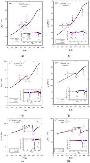 The temperature dependence of the electrical resistivity ρ of the sample with x = 0.05 is given in Figure 1a. The obvious slope change near 377 K is indicative of the ferromagnetic ordering. Below the Curie temperature TC, the ρ shows a steep decrease with decreasing temperature. This can be attributed to the disappearance of electron scattering on magnetic fluctuations. The behavior of ρ around TC is a common feature for the Heusler alloys with ferromagnetic ordering. Assuming that the break point on the ρ vs. T curves corresponds to the Curie temperature of the sample with x = 0.05, the value of TC = 377 K is very close to that determined from the initial permeability μ vs. T curve [15]. A prominent jump-like feature of ρ appears at around 250 K, indicating the occurrence of the martensitic transition. The martensitic transition temperature TM was defined by the equation: TM = (TMs + TAf)/2, where TMs and TAf are the martensitic transition starting temperature and the reverse martensitic transition finishing temperature, respectively. The values of TMs and TAf were defined as the cross points of the linear extrapolation lines of the ρ vs. T curves from both higher and lower temperature ranges. As shown in Figure 1a, a temperature hysteresis is formed around TM between 240 K and 260 K, confirming that the martensitic transition is first-order. On the other hand, such a temperature hysteresis behavior is absent for the ferromagnetic transition around 377 K. With further decrease of temperature from TM, ρ of the sample with x = 0.05 represents a typical metallic behavior. The inset in Figure 1a shows the temperature dependence of dρ/dT. A noticeable slope change in ρ(T) around 260 K marks the onset of the premartensitic transition. The premartensitic transition temperature Tp is estimated to be 264 K, as shown in the inset in Figure 1a. The values of TM and Tp are in good agreement with those determined from the magnetic measurements earlier [15]. For the sample with x = 0.025, anomalies on dρ/dT vs. T curves are observed around Tp (see the inset in Figure 1b. However, as shown in the insets of Figure 1c–f, no anomalies on dρ/dT vs. T curves are observed in the temperature range between TC and TM, indicating that the premartensitic phase disappears in the concentration range of x ≥ 0.10. As seen in Figure 1a–f, the martensitic transition temperature increases with increase of Fe concentration x. On the other hand, TC increases slightly with x.