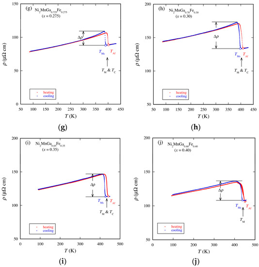 Figure 1g–j show the temperature dependence of ρ for the samples with x = 0.275, 0.30, 0.35, and 0.40. According to the phase diagram of Ni2MnGa1–xFex (0 ≤ x ≤ 0.40) reported by Hayasaka et al. [15], the samples with 0.27 ≤ x ≤ 0.37 underwent the magnetostructural transition from the Ferro-M state to the Para-A state. For the sample with x = 0.40, the Ferro-M to the paramagnetic martensite (Para-M) transition appeared. As shown in Figure 1h, the ρ increases abruptly around 402 K with deceasing temperature, indicating that the magnetic transition between the ferromagnetic phase and the paramagnetic phase was first-order. We did not observe any anomaly below TC on the ρ vs. T curves, so TM is considered to coincide with TC. The TC (=TM) was estimated to be 402 K for the sample with x = 0.30, where TC was defined to be TC = TM = (TMs + TAf)/2. Similar ρ vs. T curves are observed for the samples with x = 0.275 and 0.35 (see Figure 1g,i). As seen in Figure 1a–j, the jump of ρ at TM, ∆ρ, of the samples with x ≥ 0.20 are considerably larger than that of samples with 0.025 ≤ x ≤ 0.15.