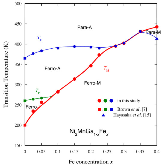 - Hayasaka, Y.; Aoto, S.; Date, H.; Kanomata, T.; Xu, X.; Umetsu, R.Y.; Nagasako, M.; Omori, T.; Kainuma, R.; Sakon, T.; et al. Magnetic phase diagram of ferromagnetic shape memory alloys Ni2MnGa1−xFex. J. Alloys Compd. 2014, 591, 280–285. [Google Scholar] [CrossRef]