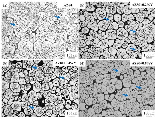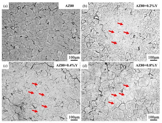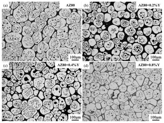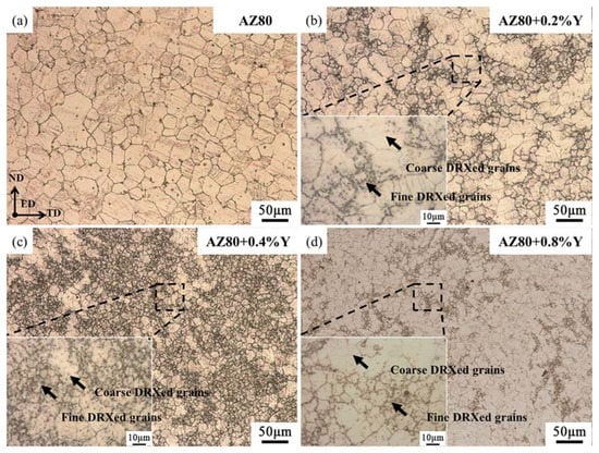 Figure 1 shows the microstructures of the as-extruded AZ80 magnesium alloy with different Y contents on the transverse section perpendicular to the extrusion direction (ED). It can be seen that Y had a remarkable effect on grain refinement. Figure 1a shows the as-extruded AZ80 without Y addition. The microstructure consists of equiaxed grains, and the average grain size is about 23.63 ± 2.52 μm. As is well known, the dynamic recrystallization (DRX) behavior is the dominant mechanism for refining α-Mg matrix grains during the hot extrusion process [23]. Some new fine grains were formed at the original grain boundaries to form a typical necklace structures. As the Y contents increased to 0.2 wt. %, the fine grains (~15.94 ± 0.98 μm) were obtained, but some coarse ones (~22.54 μm) can also be found in Figure 1b. When the addition of Y further increased to 0.4 and 0.8 wt. %, as was observed in Figure 1c,d, the bimodal microstructure was more obvious, which consists of relatively coarse DRX grains and fine DRX grains. However, the average grain sizes changed a little, corresponding to 9.74 ± 0.68 μm, 9.31 ± 0.34 μm approximately. The XRD pattern of the as-extruded AZ80 magnesium alloy with different amounts of Y addition is shown in Figure 2. Three kinds of phases can be detected in these alloys, which are α-Mg, β-Mg17Al12 and Al2Y, respectively.