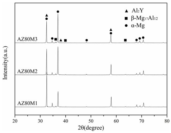XRD patterns of AZ80 magnesium alloys with different Y contents.