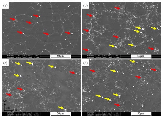 SEM images of the as-extruded alloys: (a) AZ80; (b) AZ80M1; (c) AZ80M2; and (d) AZ80M3. (β-Mg17Al12 phase marked with the red arrow; Al2Y phase marked with the yellow arrow).