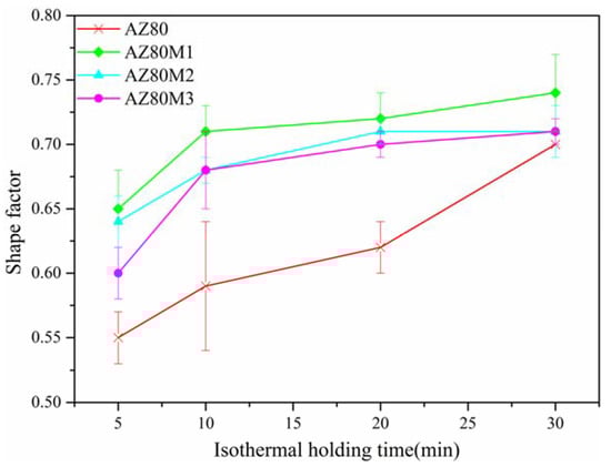 The shape factor and average grain size of solid particles are shown in Figure 8 and Figure 9, respectively. As treated for 5 min, 10 min, 20 min and 30 min, both the shape factor and average solid grain size gradually increased during the isothermal holding at 570 °C. These results indicated that the coarsening and spheroidization were introduced by the prolonging soaking time. However, the average solid grain size of the Y-containing alloys was demonstrated to be a little bigger than the AZ80 alloy when the time was no more than 10 min, which could be attributed to the β-Mg17Al12 phase segregation and resulted in grains without clear boundaries during the initial stage of isothermal treatment. Furthermore, not only the shape factor but also the average solid grain size in AZ80M alloy was lower than the unmodified ones. It can be concluded that the rare-earth Y element was valid for refining the microstructure of semi-solid magnesium alloy. In other words, the growth of solid particles has been excessively restricted by adding the rare earth Y element.