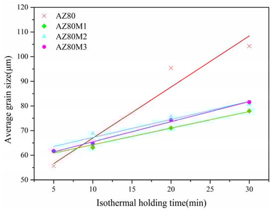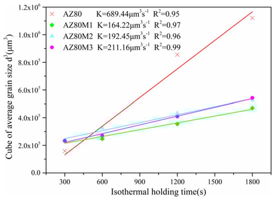 The cube of experimental results of the average solid grain sizes as a function of the isothermal holding time for the as-extruded AZ80 containing different Y contents at 570 °C is plotted in Figure 10. The value of D0 was the average grain size when the soaking time was 5 min in this paper. It can be confirmed that the coarsening kinetics of all the four kinds of alloys during the isothermal heating had the best correlation with Equation (4). This was determined by the regression coefficient (R2) of the fitted straight lines all close to 1. The values of k obtained from the slope of fitted lines in Figure 10 were 689.44 μm3·s−1, 164.22 μm3·s−1, 192.45 μm3·s−1 and 211.16 μm3·s−1 in AZ80, AZ80M1, AZ80M2 and AZ80M3 alloy, respectively. It was shown that the coarsening rate was significantly slower by adding a Y element due to the reduction of the solid–liquid interfacial energy. In addition, it was clearly noticed that the minimum k value achieved in the extruded AZ80M1 was approximately 4.2 times less than the maximum one in the non-modified AZ80 alloy. However, with the further addition of Y up to 0.4 and 0.8 wt. %, a slightly increased k value was found. This rise may be attributed to the change of liquid phase fraction, as shown in Table 2. Usually, the particle growth also depends on diffusion or flow of solute atoms between the solid particles of different sizes. The experimental results were similar to the results observed by Ferrante et al. [34] and Manson-Whitton et al. [35]. They reported that either the compressed or the spray formed Al-4Cu (wt. %), and the increase in the quantity of liquid fraction could accelerate the coarsening rate of solid particles during the isothermal treatment because the liquid could provide a much faster diffusion path than the solid. In cases where the continuous liquid path was formed around the spherical solid α-Mg, the coarsening effect can be accelerated. Considering that mentioned above, the AZ80M1 possesses the superior slow coarsening rate, which could serve as the best semi-solid feedstock for the thixotropic behavior.