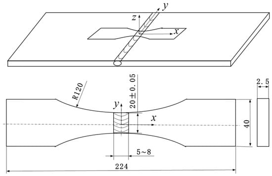 In this work, the experimental material is TA15 titanium alloy, which is manufactured in China. Its main chemical components are shown in Table 1. The specimens were designed according to GB/T3075-2008, as shown in Figure 1. The titanium-alloy plates were milled, and the roughness of all surfaces were no larger than 3.2 μm. Before welding, the surfaces of the titanium-alloy plates were cleaned using acetone to protect weld zones from oil, moisture, dirt and other impurities. Then, the titanium-alloy plates were butt-welded along the longitudinal direction, and a shielding gas of argon was continually provided during the molten pool welding solidification process to prevent the generation of weld pores. After welding, vacuum annealing (holding 120–180 min at 600 °C and then being cooled inside the furnace to room temperature) was performed on titanium-alloy plates to remove residual stresses and stabilize the microstructure. The fatigue specimens were machined from the gas tungsten arc-welded sheets.