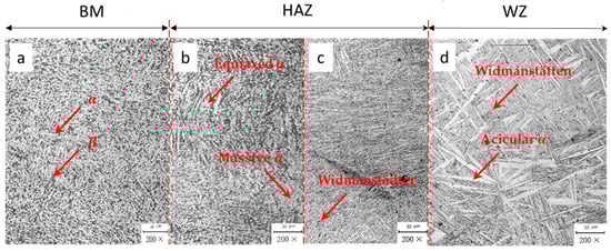 The optical micrographs (OLYMPUS PME3, Beijing, China) of different welded regions, etched by 5 vol % HF and 12 vol % HNO3 in water, are shown in Figure 2. The base metal (BM) microstructure is an equiaxed α + β structure. The weld zone (WZ) microstructure is a Widmanstädter structure with serrate and thick acicular α, which can be attributed to the high heat input and fast cooling during the GTAW process. The heat-affected zone (HAZ) near the WZ consists of a slender lamellar Widmanstädter structure, while the HAZ near the BM consists of the equiaxed α and massive α, which shows a gradual change from WZ to BM due to the temperature gradients.